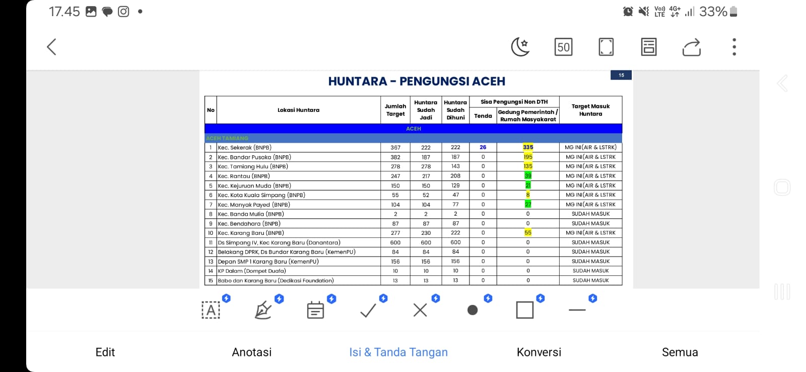 Pemerintah juga mencatat masih terdapat 2.007 pengungsi yang belum menempati huntara, serta 26 kepala keluarga yang masih berada di tenda darurat. Sementara sebagian lainnya masih menempati fasilitas umum seperti gedung pemerintah dan rumah masyarakat.